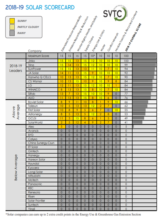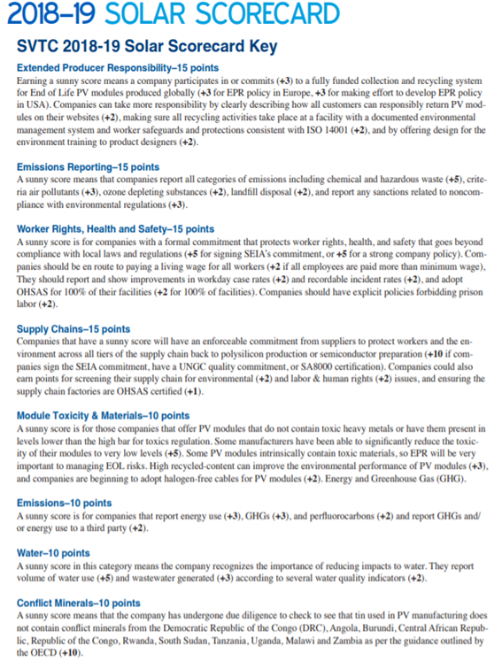 De SSC, ontwikkeld door non-profit organisatie Silicon Valley Toxics Coalition, toont aan welke bedrijven de meest duurzame zonnepanelen produceren. De Solar Scorecard houdt daarvoor de voetafdruk van 37 grote producenten van zonnepanelen bij, waarbij zij beoordeeld worden op (onder andere) water- en elektriciteits-verbruik, werkveiligheid, grondstoffengebruik – en waar die vandaan komen, reycling van de zonnepanelen en CO2-uitstoot (tevens rekening houdend met vervoerswijze, etc.).